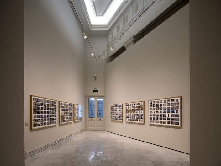 Para mostrar el resultado escojo una forma que se inspira en la idea clásica de la hoja de contactos, pero para mejorar la comprensión de la propuesta aprovecho las potentes posibilidades de edición, ordenación y rotulación de los programas actuales de procesado de imágenes. Las fotografías están dispuestas cronológicamente y con la indicación de la hora y el minuto en que las he hecho porque deseo que se puedan reconstruir los recorridos y que se sepa dónde me he detenido y qué ha llamado mi atención. Gracias a que las hojas son grandes cabe apreciar el detalle de cada fotografía. Pero este modo de contemplar las hojas –sobrevolarlas de cerca y por orden– no es el único posible. Vistas desde lejos, en la comparación, aparecen patrones, texturas, motivos y temas que revelan tanto las maneras de Adaro como la capacidad de la fotografía para ir más allá de la descripción verbal.