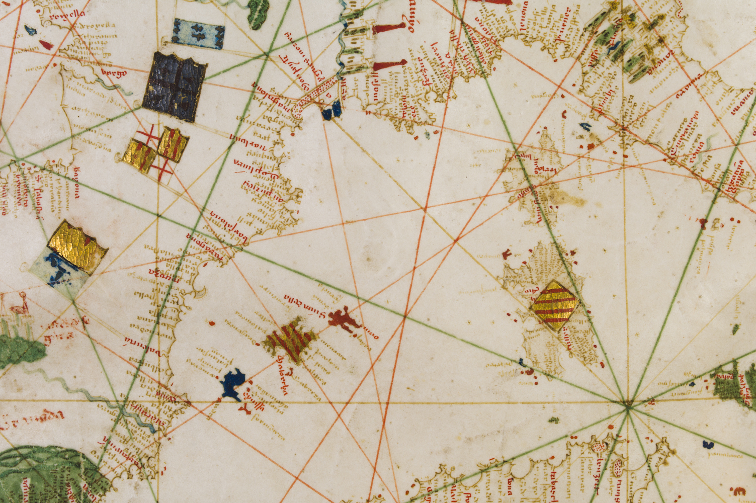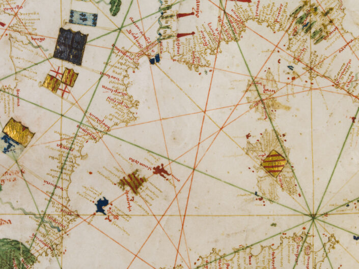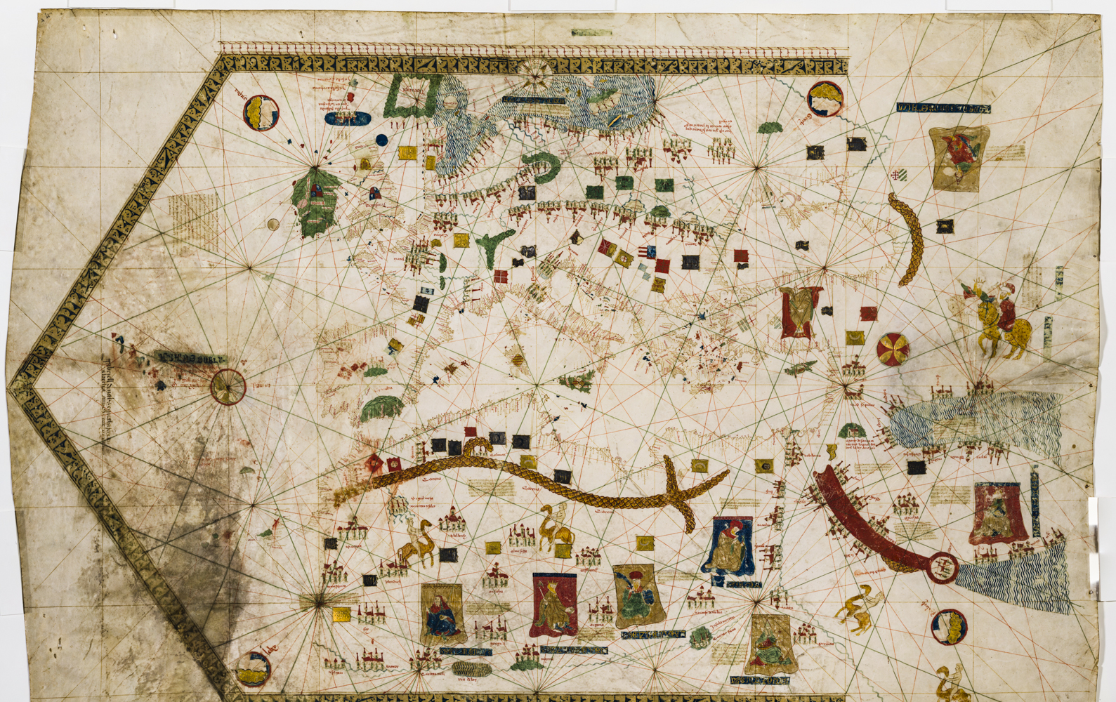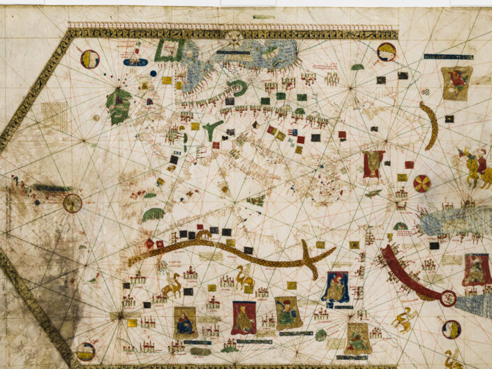 Romà Escalas me comisionó en 2013 para que fotografiara el portulano de Gabriel de Vallseca. Depositado en el Museo Marítimo de Barcelona, esta carta náutica sobre pergamino se realizó en 1439 en el taller de Palma de un judío converso. Perteneció a Amerigo Vespucci, quien pagó ciento treinta ducados de oro por él. Mide aproximadamente 0,75 x 1,12 metros y representa con gran detalle el mundo como se le conocía entonces. Abarca de las Azores al Golfo Pérsico y de Noruega al Sáhara. En 1892 el capitán de navío José Gómez-Imaz realizó una copia facsímil del portulano y comprobó su gran exactitud comparándolo con las cartas marinas más modernas. Hay una anécdota que relaciona este portulano con la estancia en Mallorca de George Sand y Chopin entre noviembre de 1838 y febrero de 1839. En una visita que la pareja hizo a quien entonces lo poseía, alguien volcó un tintero sobre uno de los bordes, como atestigua la mancha que aun perdura.